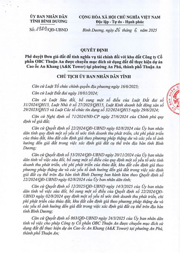 A&K Tower được phát triển trên nền tảng pháp lý rõ ràng và minh bạch, mang đến sự an tâm tuyệt đối cho khách hàng và nhà đầu tư. Dự án đã hoàn tất phê duyệt bảng giá đất theo quy định của cơ quan chức năng, làm căn cứ hợp pháp cho việc tính toán chi phí đầu tư và thực hiện đầy đủ nghĩa vụ tài chính với Nhà nước.